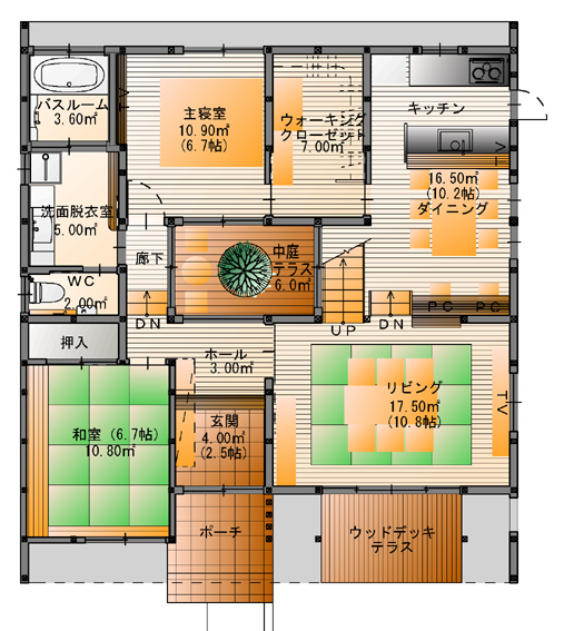 <中庭とスキップフロアーってどんなメリットがあるの?> 中庭を通して各お部屋に光が溢れます。 中庭を通して風が自然に抜けていきます。 (留守の時も中庭の窓を開けておけば外から帰って来てもあのムッとする暑さから解消されます。) スキップフロアーは、緩やかに2階に上るため1階と2階の高さが気にならない。 スキップフロアーの床下の空間を利用してコストを掛けないで大きな倉庫が出来上がります。 (必要部屋は有っても収納が少ない住宅が多い中、床を1m上げるだけで大きなフリースペースとして利用できます) 中庭とスキップフロアーにより空間に一体感が出来、家族の絆が深まります。